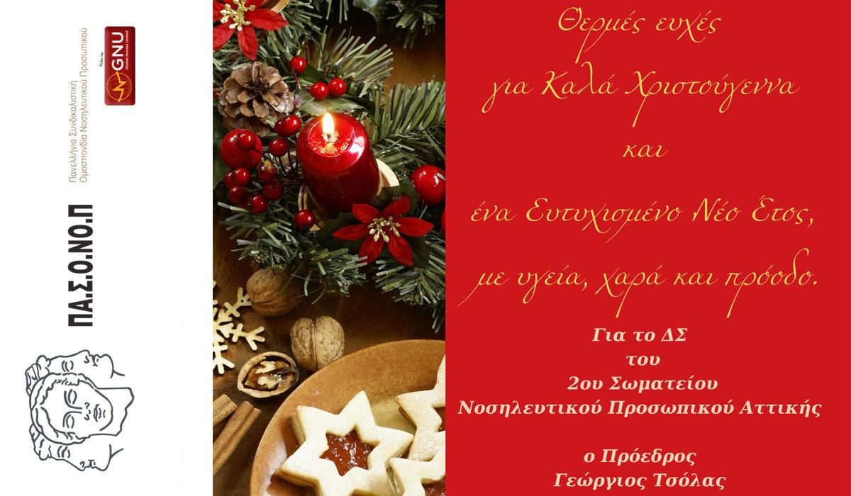 Το Διοικητικό Συμβούλιο του 2ου Σωματείου Νοσηλευτικού Προσωπικού Αττικής σας εύχεται Θερμές Ευχές για Καλά Χριστούγεννα & ένα Ευτυχισμένο Έτος με υγεία, χαρά και πρόοδο.