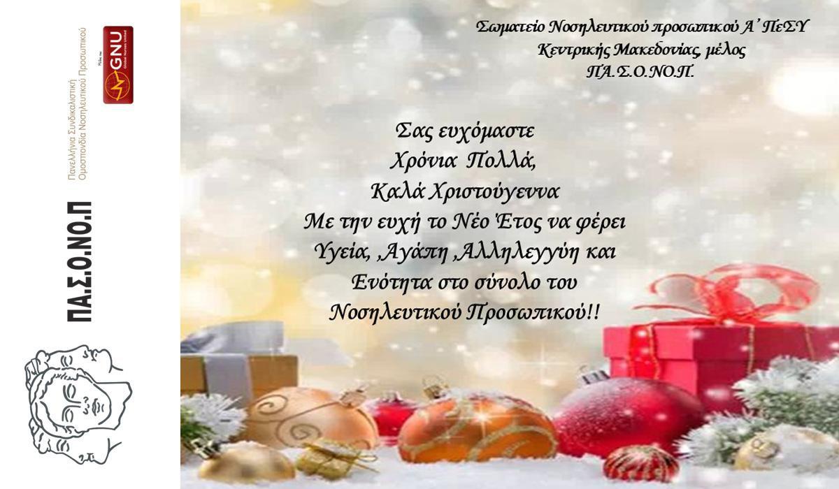 Το διοικητικό Συμβούλιο του Σωματείου Νοσηλευτικού Προσωπικού Α΄ΠΕΣΥ Κεντρικής Μακεδονίας εύχεται Χρόνια Πολλά Καλά Χριστούγεννα. Με την ευχή το Νέο Έτος να φέρει Υγεία, Αγάπη, Αλληλεγγύη και Ενότητα στο σύνολο του Νοσηλευτικού Προσωπικού.