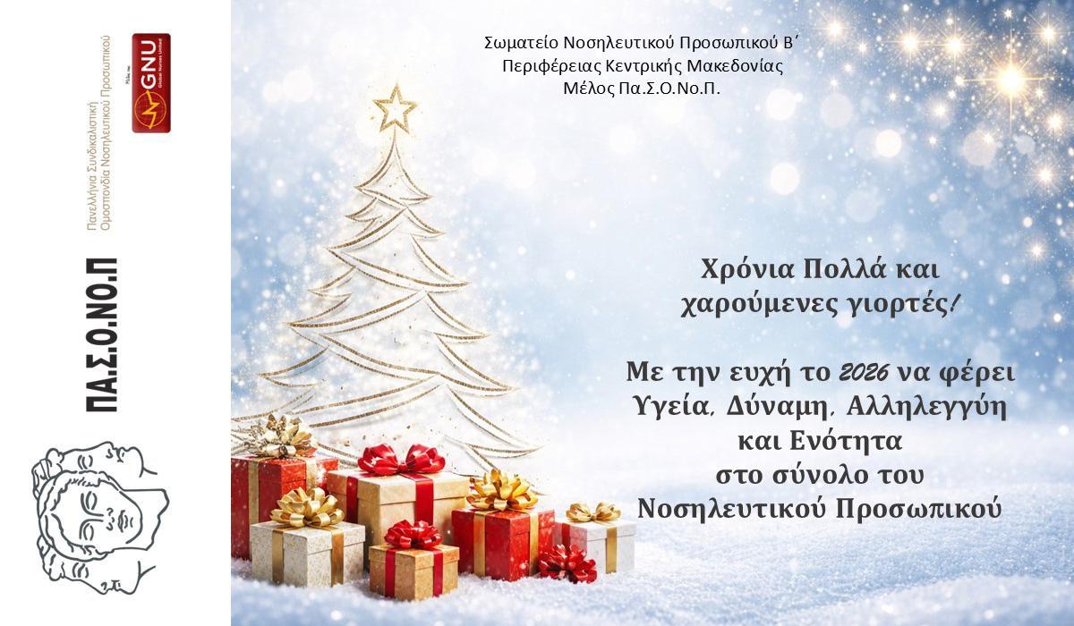 Το Διοικητικό Συμβούλιο του Σωματείου Νοσηλευτικού Προσωπικού Β΄Περιφέρειας Κεντρικής Μακεδονίας εύχεται Χρόνια Πολλά και χαρούμενες γιορτές! Με την ευχή το 2026 να φέρει Υγεία ,Δύναμη, Αλληλεγγύη και Ενότητα στο σύνολο του Νοσηλευτικού Προσωπικού!