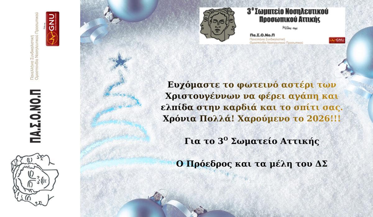 Το Διοικητικό Συμβούλιο του 3ου Σωματείου Νοσηλευτικού Προσωπικού Αττικής, ευχόμαστε το φωτεινό αστέρι των Χριστουγέννων να φέρει Αγάπη και Ελπίδα στην καρδιά και το σπίτι σας. Χρόνια Πολλά! Χαρούμενο το 2026!