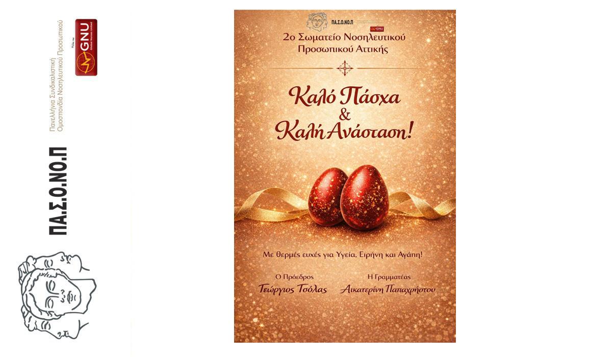 Το Δ.Σ. του 2ου Σωματείου Νοσηλευτικού Προσωπικού Αττικής σας εύχεται υγεία, ελπίδα και χαρές σε εσάς και τις οικογένειές σας. Το Άγιο Φως της Ανάστασης να φέρει αισιοδοξία και γαλήνη σε κάθε σπίτι.
